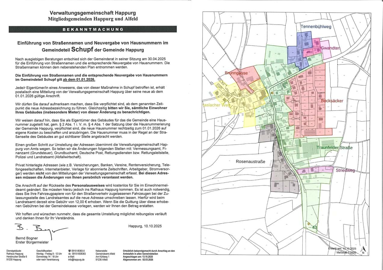10. Oktober 2025: Die Einführung von Straßennamen und die entsprechende Neuvergabe von Hausnummern im Gemeindeteil Schupf gilt ab dem 01.01.2026.